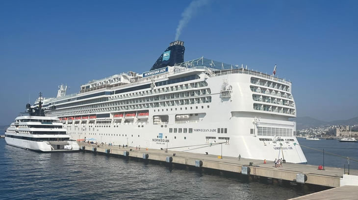 Bodrum Cruise Port Limanı'na, 2 bin 159 yolcusuyla Bahama bayraklı 294 metrelik "Norwegian Jade" isimli kruvaziyer ile 72 yolcusuyla Bahama bayraklı 110 metrelik "Emerald Azurra" adlı kruvaziyer yanaştı.