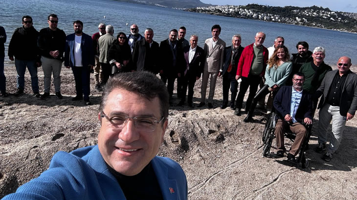 Toplantı sonunda basın mensupları ile sahil kenarında hatıra fotoğrafı çektirmeyi de ihmal etmeyen Tosun, telefonunu alarak selfie çekti.