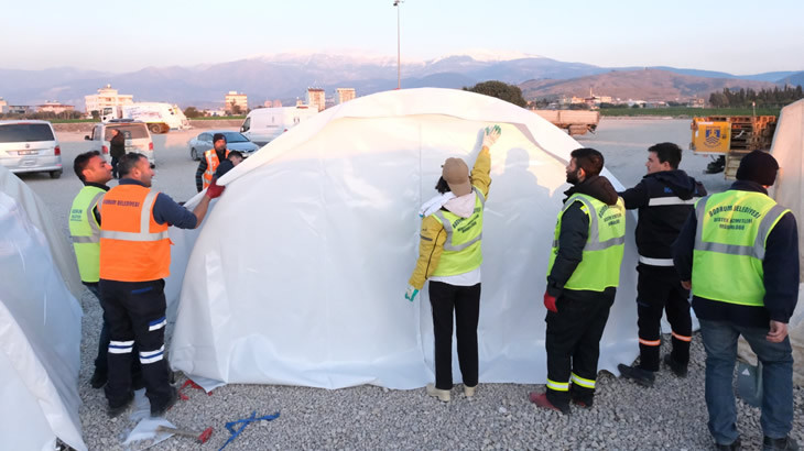 Bodrum Belediyesi tarafından İskenderun ve Arsuz arasında bulunan Expo merkezinin yanındaki alanda bin kişiye hizmet verecek çadır kent ve aş evinin kurulumu tamamlandı. “ Bodrum Belediyesi Hatay-Arsuz Dostluk Kenti” nde koordinasyon ise bizzat Bodrum Belediye Başkanı Ahmet Aras tarafından yürütülüyor.