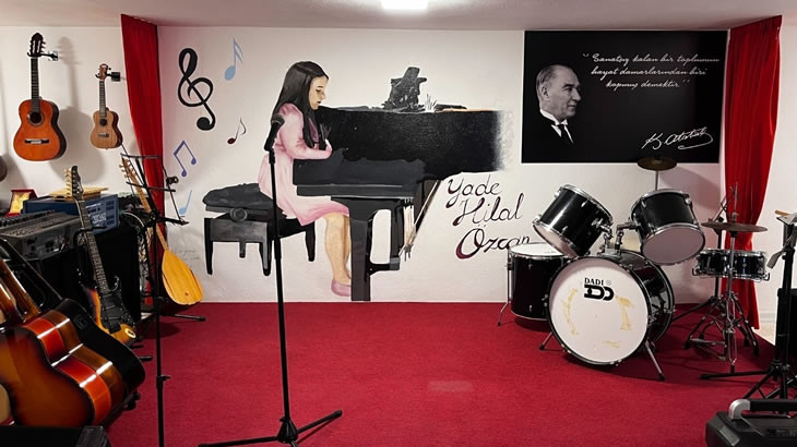 İlçe Milli Eğitim Müdürü Aslan Korkmaz, anne Ayşegül Özcan, Yade'nin öğretmenleri ve arkadaşlarının katılımıyla müzik atölyesinin açılışı yapıldı.