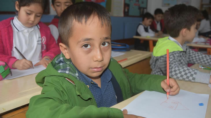 Hüseyin Boyacı İlkokulu'nda 46 öğrenci yeniden eğitim ve öğretime başladı. Öğrenciler ilk ders zilinde arkadaşlarıyla kaynaşırken, resim de çizdi. Kahramanmaraş'taki evini, okulunu bırakıp ilçeye gelen 1'inci sınıf öğrencisi Ali Eren Kırıcı'nın çizdiği ilk resim bir ev olurken, sınıf başkanı seçilen Hatay'dan gelen Kıvanç Mörer (6) ise araba ve gökkuşağı çizdi.